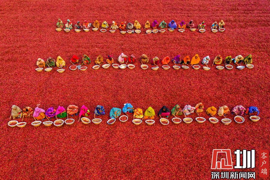 孟加拉國伯格拉,航拍穿著五顏六色衣服的工人們排列整齊的分揀辣椒。