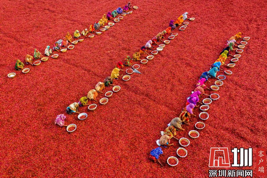 航拍孟加拉國(guó)工人分揀辣椒 滿眼火紅大地如鋪上地毯