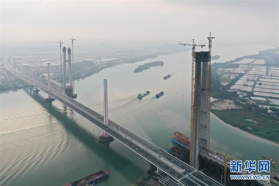 3月18日,施工人員在廣州南沙港鐵路跨西江斜拉橋東主塔進行封頂施工(無人機照片)。新華社記者劉大偉攝