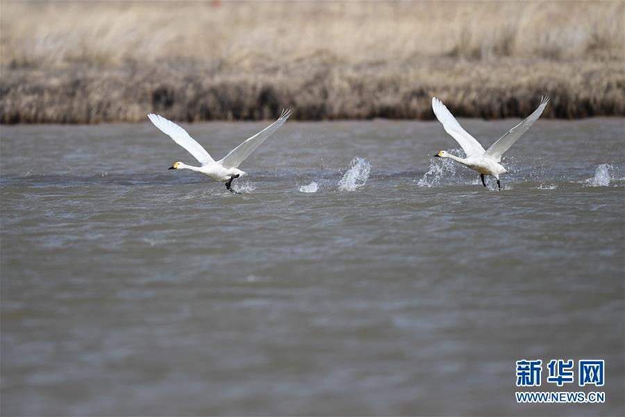3月18日,候鳥在準(zhǔn)格爾旗大路鎮(zhèn)的黃河淺灘上起飛。 新華社記者 于嘉 攝