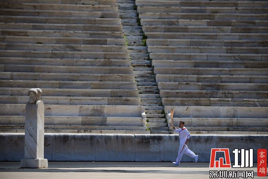 3月19日,希臘藝術(shù)體操運(yùn)動(dòng)員埃萊夫塞里奧斯·彼得羅尼亞斯手持圣火火炬跑入體育場。