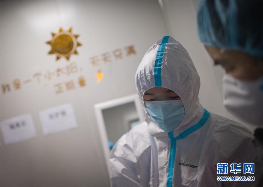 3月19日,在武漢市肺科醫(yī)院清潔區(qū),浙江醫(yī)療隊隊員在穿戴防護(hù)服。 新華社記者 肖藝九 攝