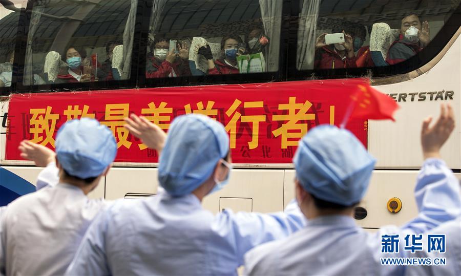 3月21日,武漢市第一醫(yī)院的醫(yī)護(hù)人員(前)送別天津市醫(yī)療隊(duì)隊(duì)員。新華社記者費(fèi)茂華攝