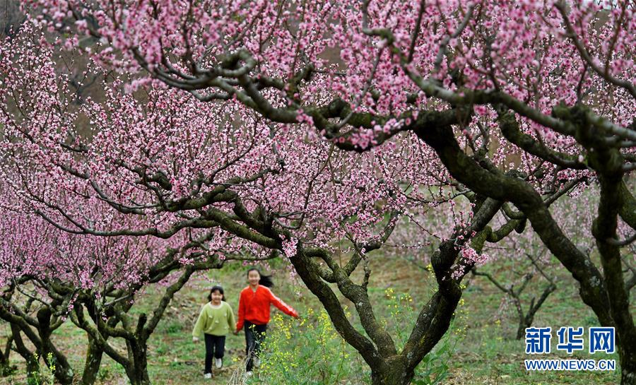 3月22日,兩位小朋友穿行在柳山湖畔盛開的桃花叢中。陽(yáng)春三月,陜西省漢中市洋縣龍亭鎮(zhèn)柳山村,1300畝桃園的花朵綻放。新華社記者陶明攝