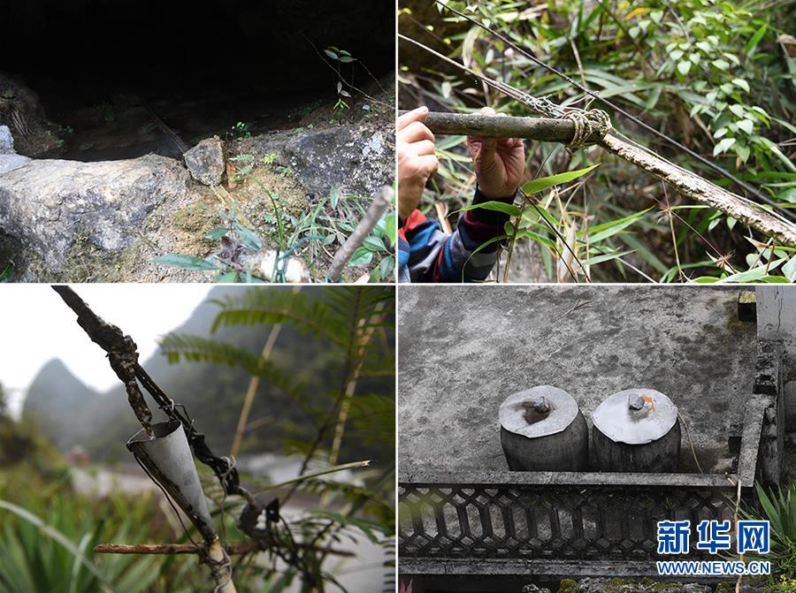 這張拼版圖片顯示廣西都安瑤族自治縣澄江鎮(zhèn)自成村加倫屯村民黃景飛獨(dú)創(chuàng)的“鐵線引水”法(2018年3月16日攝)。左上圖為竹枧將山泉水從山洞引出;右上圖為竹枧將山泉水引到鐵線上;左下圖為一個(gè)特制的漏斗將水接入膠管里;右下圖為膠管將山泉水送到水缸里。廣西有近一半貧困人口生活在石漠化地區(qū),涉及數(shù)十個(gè)縣區(qū)。這里也是廣西飲水保障程度最低的地區(qū),解決貧困人口飲水問題是廣西脫貧攻堅(jiān)戰(zhàn)“硬仗中的硬仗”?!笆濉币詠恚瑥V西加快實(shí)施農(nóng)村飲水安全鞏固提升工程。因地制宜,采取新建、擴(kuò)建及管網(wǎng)延伸等多種措施,補(bǔ)齊貧困地區(qū)水利薄弱短板,進(jìn)一步提升石漠化地區(qū)群眾飲水安全保障水平,助推脫貧攻堅(jiān)。新華社記者陸波岸攝