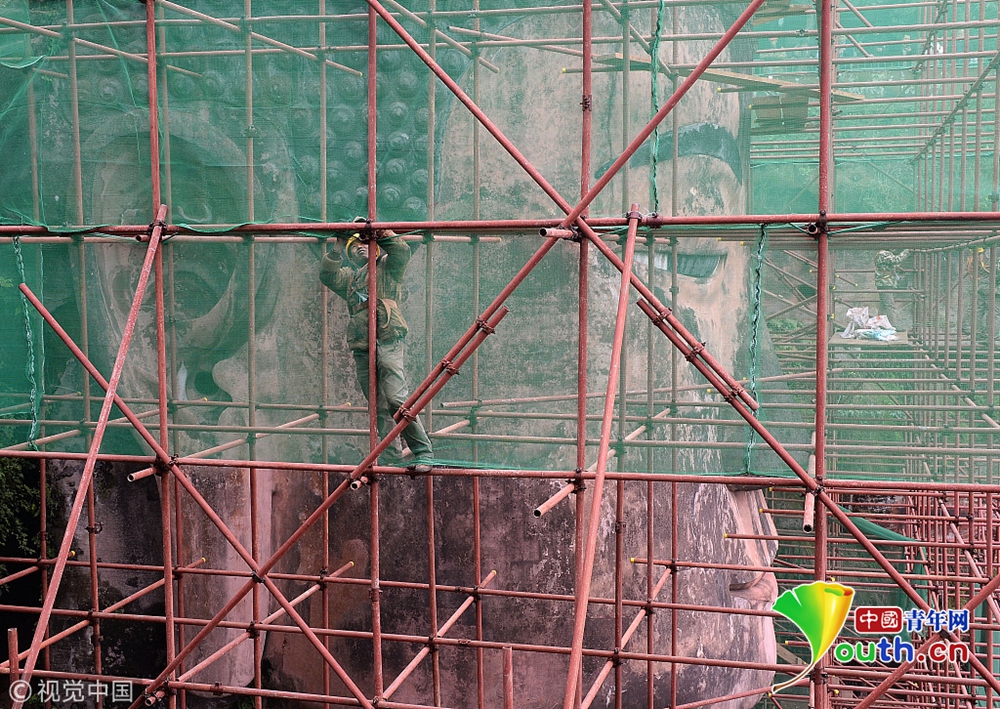 工人在搭建腳手架(10月19日攝)。圖中下方顯示,大佛腳趾有明顯的破損。新華社記者張超群攝