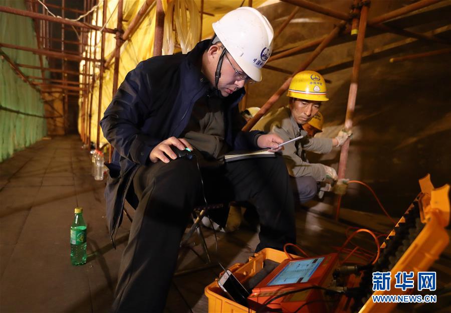 中鐵西北科學(xué)研究院有限公司文保中心的工程師孫博(左)在檢測探頭的數(shù)據(jù)穩(wěn)定性(3月18日攝)。新華社記者江宏景攝