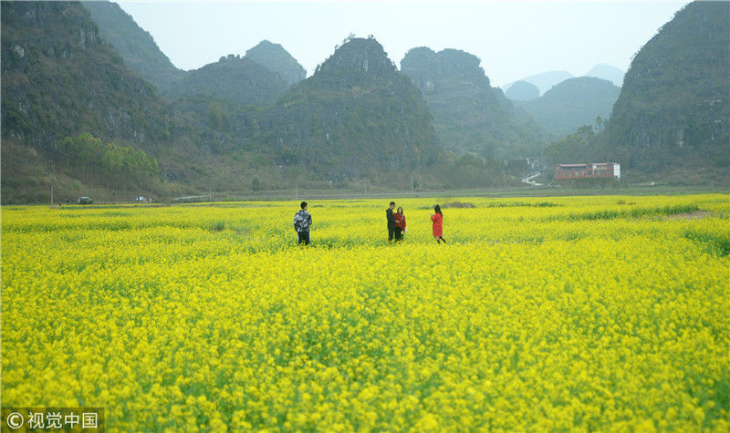2019年2月5日,春節(jié)期間,廣西來賓市忻城縣萬余畝油菜花競相綻放,吸引眾多游客前來賞花游玩,感受春天的氣息。近年來,廣西忻城縣大力實施鄉(xiāng)村振興戰(zhàn)略,注重發(fā)展鄉(xiāng)村旅游產(chǎn)業(yè),把鄉(xiāng)村旅游與美麗鄉(xiāng)村、脫貧攻堅緊密結(jié)合起來,輻射帶動當?shù)刎毨裘撠氈赂?。樊紹光/視覺中國