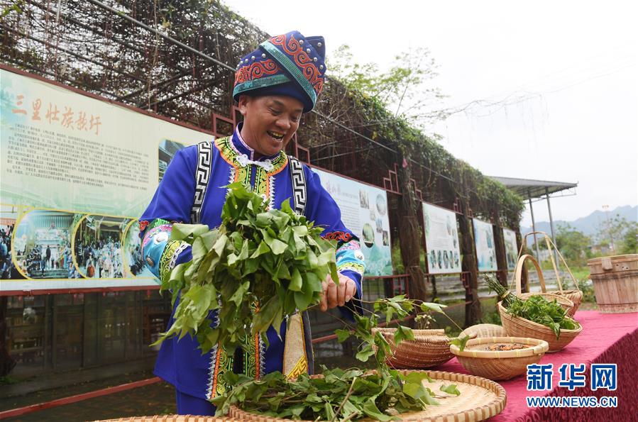 3月25日,在廣西上林縣巷賢鎮(zhèn),一名壯族村民在準備做五色糯米飯。新華社記者陸波岸攝