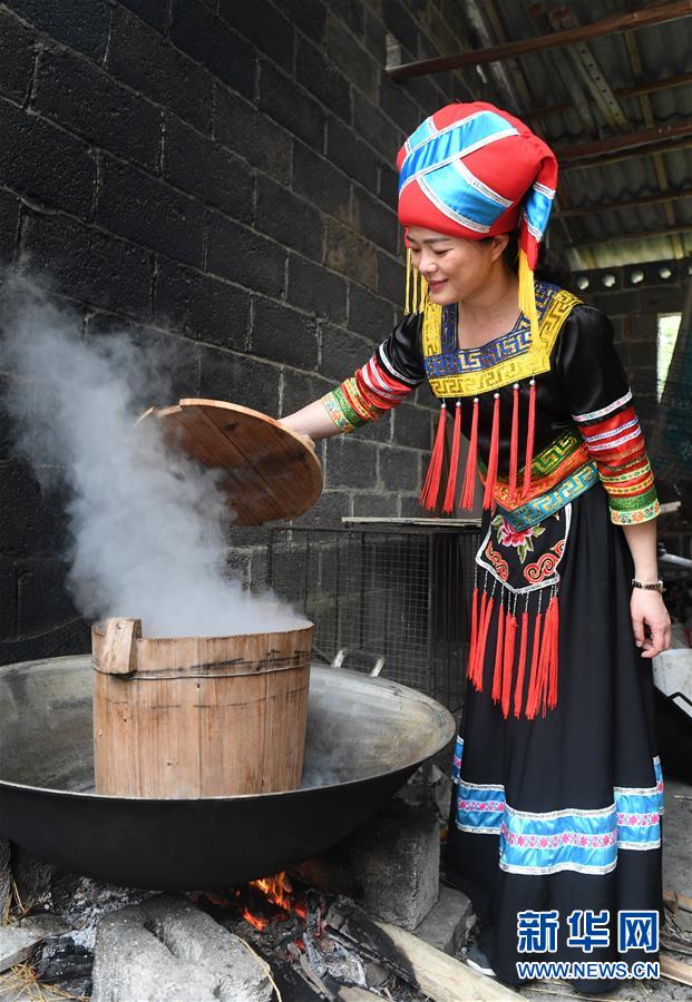 3月25日,在廣西上林縣巷賢鎮(zhèn),一名壯族女子在蒸制五色糯米飯。新華社記者陸波岸攝