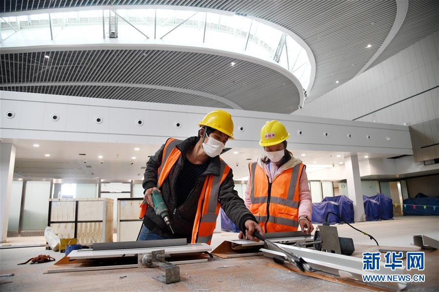 3月25日,兩名工人在青島膠東國際機場航站樓中央景觀區(qū)施工。新華社記者李紫恒攝