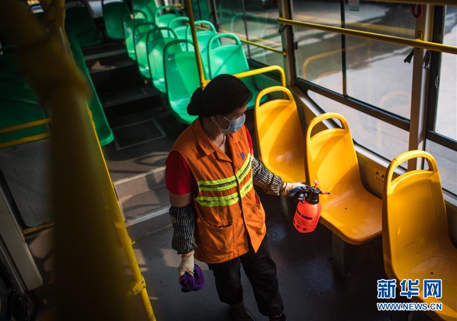 3月23日,在武昌火車站公交車總站,武漢公交集團站務(wù)公司保潔員趙真香在為一輛公共汽車消毒清洗。新華社記者肖藝九攝