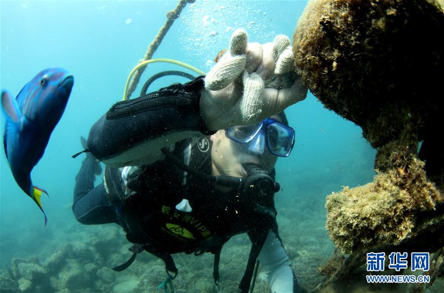 在位于海南三亞蜈支洲島旅游區(qū)的海洋牧場,工作人員在清理監(jiān)控設(shè)備(3月27日攝)。近日,位于海南三亞蜈支洲島旅游區(qū)的海洋牧場復(fù)工,海底作業(yè)逐漸恢復(fù)正常,開始進(jìn)行人工魚礁吊裝擺位、水下監(jiān)控清理以及日常巡護(hù)等工作。據(jù)介紹,人工魚礁有利于魚類種類增加和數(shù)量提高,蜈支洲島海域海洋牧場人工魚礁表面附著珊瑚、貝類、藻類等生物種類達(dá)120余種。新華社記者楊冠宇攝