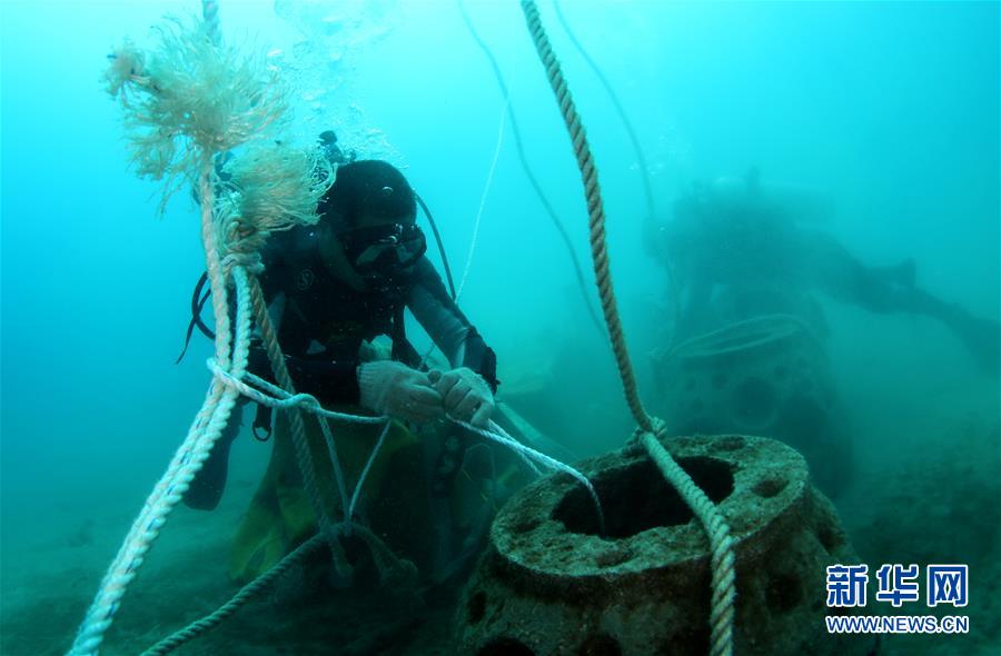3月28日,在位于海南三亞蜈支洲島旅游區(qū)的海洋牧場(chǎng),工作人員在海底用繩子綁住人工魚(yú)礁,準(zhǔn)備進(jìn)行吊裝擺位作業(yè)。近日,位于海南三亞蜈支洲島旅游區(qū)的海洋牧場(chǎng)復(fù)工,海底作業(yè)逐漸恢復(fù)正常,開(kāi)始進(jìn)行人工魚(yú)礁吊裝擺位、水下監(jiān)控清理以及日常巡護(hù)等工作。據(jù)介紹,人工魚(yú)礁有利于魚(yú)類種類增加和數(shù)量提高,蜈支洲島海域海洋牧場(chǎng)人工魚(yú)礁表面附著珊瑚、貝類、藻類等生物種類達(dá)120余種。新華社記者楊冠宇攝
