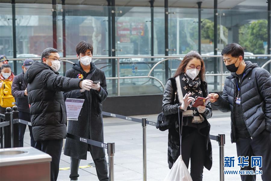 3月30日,在武漢市武商廣場外,人們在工作人員指引下,用手機(jī)掃描健康碼后進(jìn)入商場購物。當(dāng)日,武漢市多家商場開門迎客。新華社記者沈伯韓攝