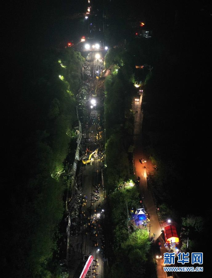 3月30日晚,工程機(jī)械在京廣鐵路郴州段脫軌事故現(xiàn)場(chǎng)作業(yè)(無人機(jī)照片)。新華社記者李尕?cái)z