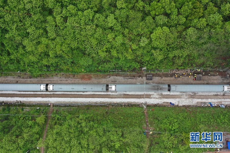4月1日,Z201次旅客列車通過京廣鐵路郴州段脫軌事故區(qū)段(無人機(jī)照片)。新華社記者李尕?cái)z