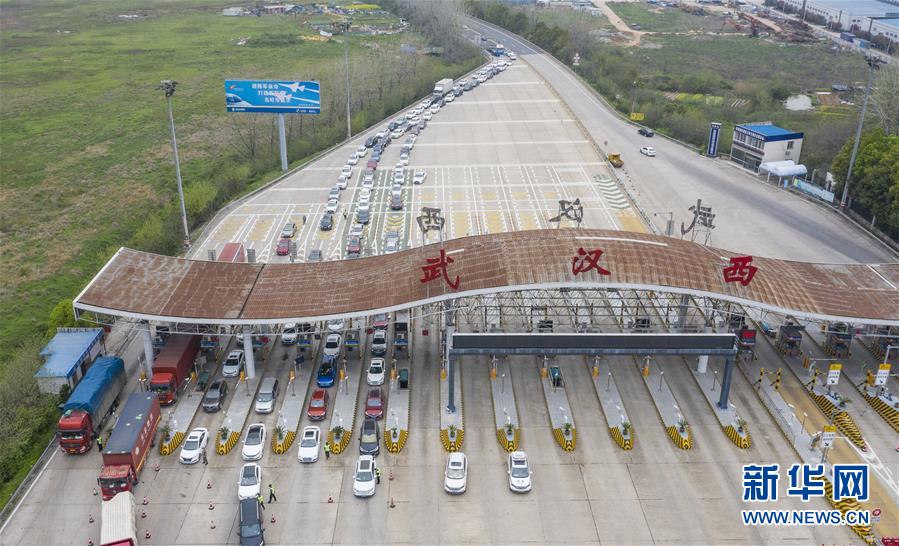3月24日,在武漢西高速收費(fèi)站交通卡點(diǎn),返漢車輛排隊(duì)等候入城(無人機(jī)照片)。新華社記者才揚(yáng)攝