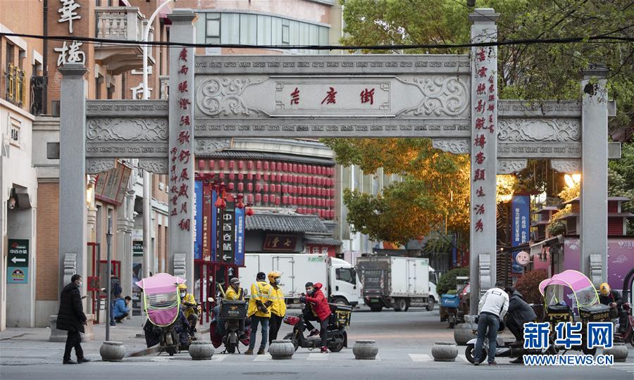 4月1日,外賣騎手在吉慶街等待接單。 新華社記者費(fèi)茂華攝