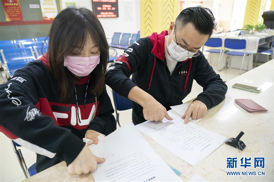 4月7日,在武漢市江岸區(qū)民政局婚姻登記處,陳先生與張女士辦理結(jié)婚登記手續(xù)時按手印。 新華社記者才揚(yáng)攝