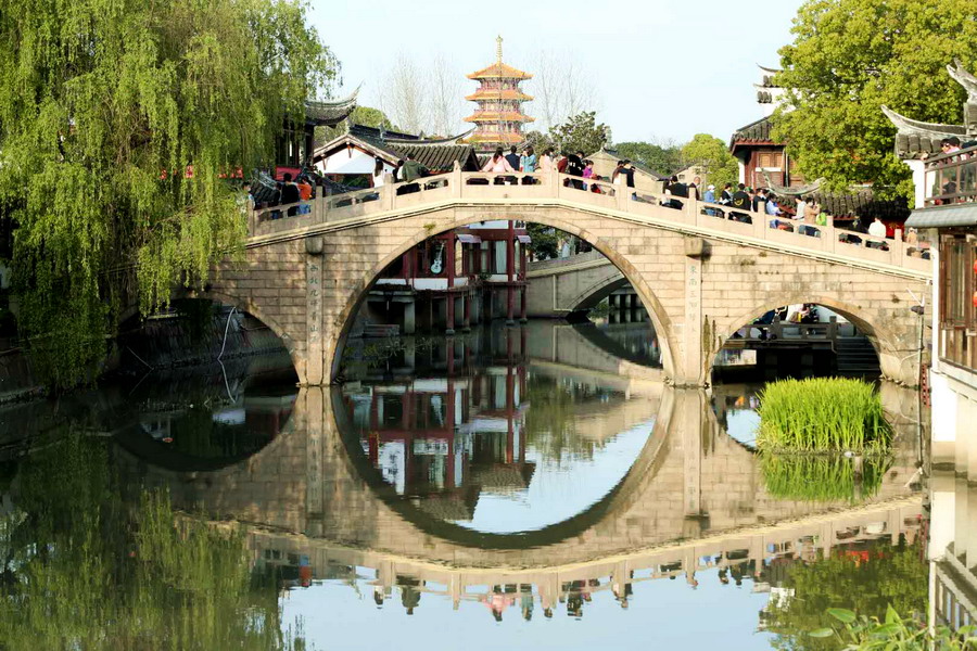 2020年4月5日,上海。清明小長(zhǎng)假第二天,上海各景點(diǎn)客流攀升,游客戴口罩有序出游,踏春、防疫兩不誤。在上海千年古鎮(zhèn)七寶老街看到游客川流不息、人頭攢動(dòng)。古鎮(zhèn)在各入口做好防疫措施、控制客流量。