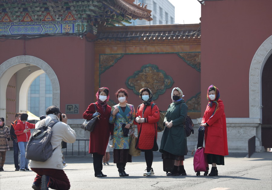 2020年4月6日,遼寧沈陽,北陵公園在清明小長假的最后一天,游客猛增。市民對各項(xiàng)游戲都踴躍參與。圖為穿著美美長裙的阿姨們在合影。