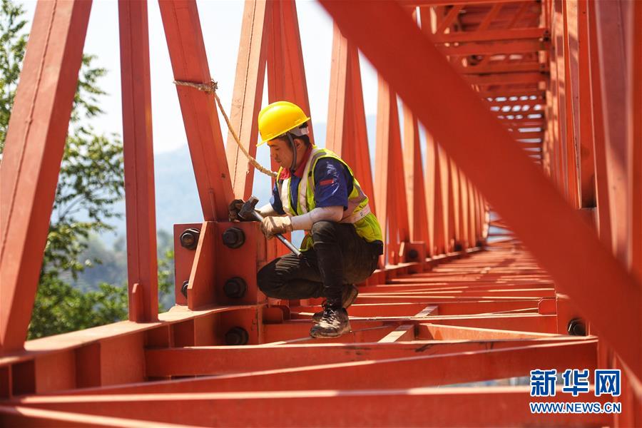 在位于普洱市的木乃河雙線特大橋工程現(xiàn)場,工人鐘琪在檢查螺絲緊固情況(4月12日攝)。新華社記者秦晴攝