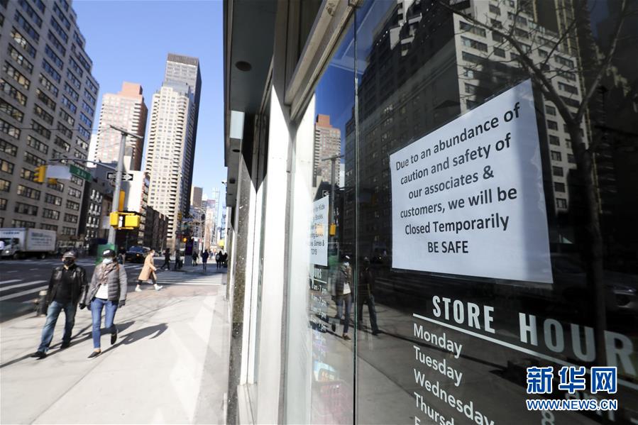 3月21日,在美國紐約時報廣場,一家服裝店貼出閉店告示。美國紐約州、伊利諾伊州、康涅狄格州20日發(fā)布針對本州居民的“居家令”,以遏制新冠病毒傳播。這些“居家令”涵蓋紐約、洛杉磯、芝加哥等大城市,影響數(shù)千萬人。白宮20日發(fā)表聲明說,總統(tǒng)特朗普已宣布紐約州出現(xiàn)“重大災(zāi)難”,命令聯(lián)邦政府支援該州抗擊新冠肺炎疫情。新華社記者王迎攝