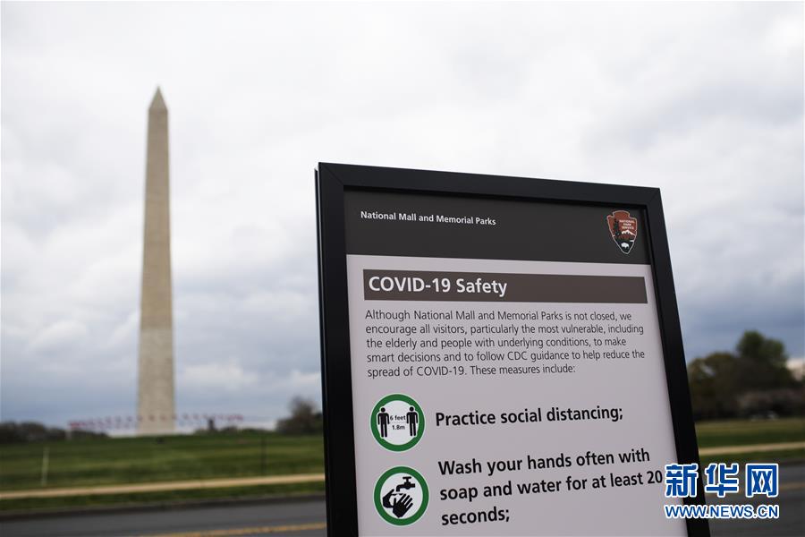 這是4月1日在美國華盛頓紀(jì)念碑附近拍攝的新冠肺炎疫情防控提示牌。新華社記者劉杰攝