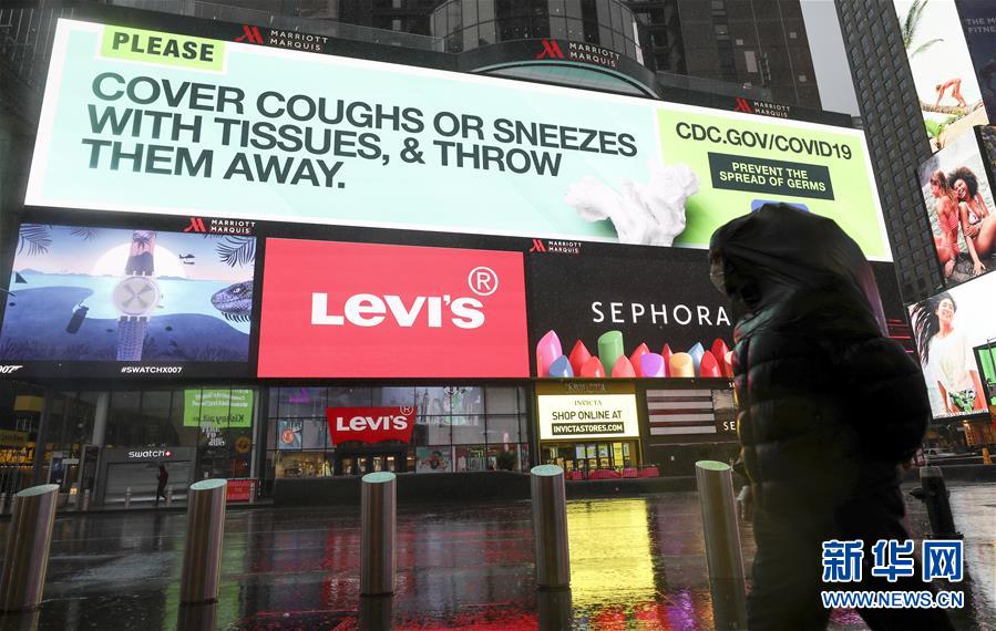 3月23日,在美國紐約時報廣場,大屏幕上播放防控新冠肺炎的知識。新華社記者王迎攝