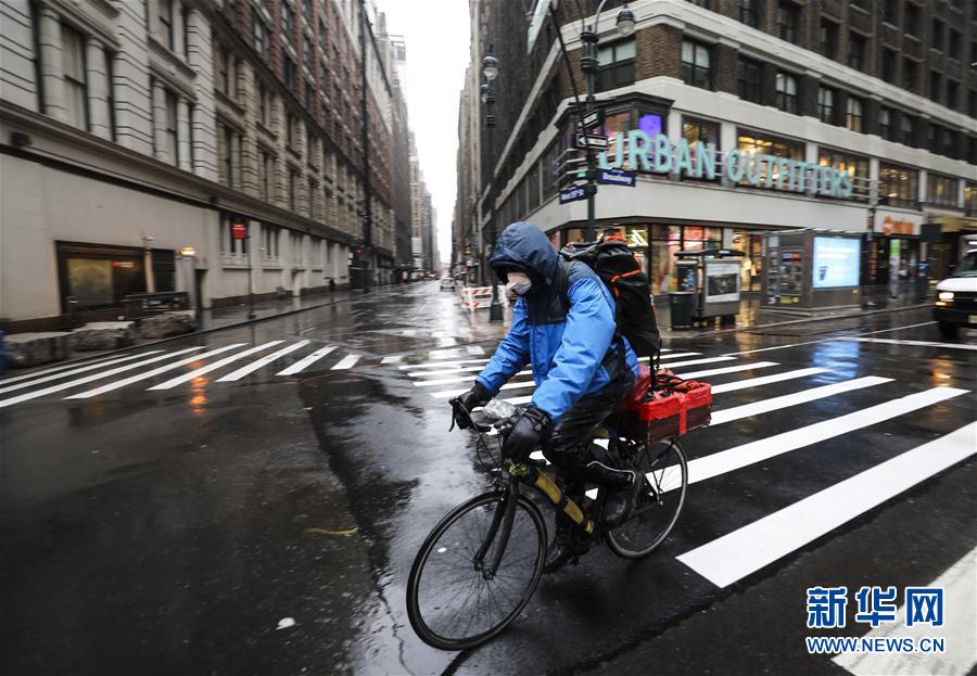 3月23日,一名外賣送貨員戴口罩騎行在美國紐約街頭。新華社記者王迎攝