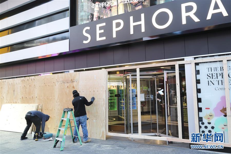 3月21日,在美國紐約時報廣場,工人用木板封閉一家化妝品店。新華社記者王迎攝