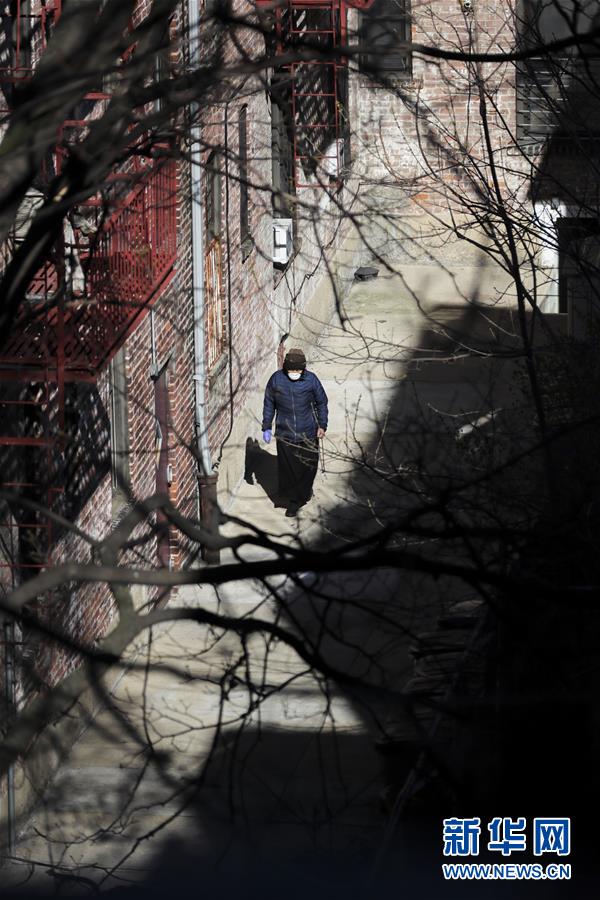 4月1日,在美國紐約,居民在一處住宅樓的院子里散步。新華社記者王迎攝