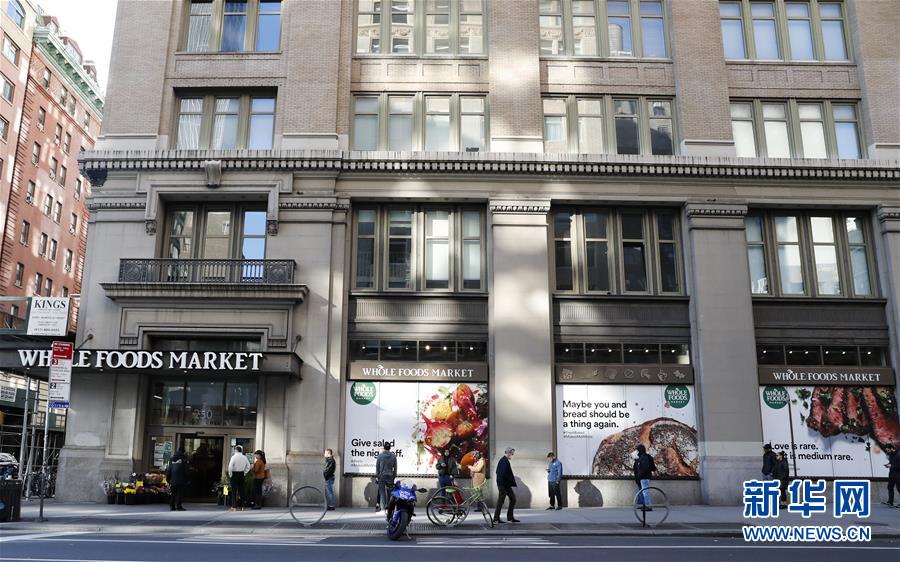 3月21日,在美國紐約,人們排隊時保持距離,準(zhǔn)備進入一家超市購物。新華社記者王迎攝