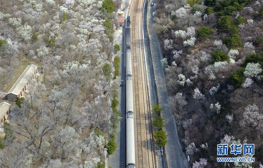 4月8日,北京青龍橋火車(chē)站附近春花盛開(kāi)(無(wú)人機(jī)照片)。  新華社記者張晨霖?cái)z