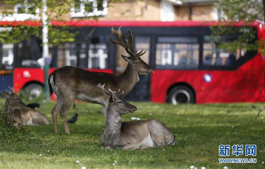 4月8日,在英國倫敦東部一個(gè)居民區(qū),附近公園里的鹿在草坪上休息。隨著新冠疫情在英國的擴(kuò)散,政府要求人們減少不必要的外出。倫敦東部一個(gè)居民區(qū)附近公園里原來散養(yǎng)的鹿紛紛從公園走出來,或吃草或接受附近居民的喂食,成為特殊時(shí)期居民區(qū)里的新“客人”。新華社記者韓巖攝