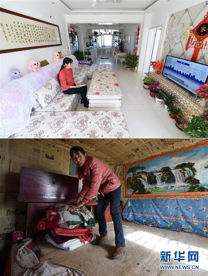 拼版照片:上圖為胥存在古浪縣綠洲生態(tài)移民小城鎮(zhèn)整理家中臥室(4月7日攝);下圖為胥存在古浪縣黃羊川鎮(zhèn)石城村收拾家中床上物品(2018年2月6日攝)。新華社記者范培珅攝