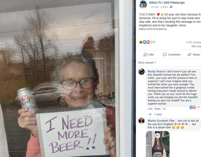 中新網(wǎng)4月14日電據(jù)美國(guó)《世界日?qǐng)?bào)》報(bào)道,近日居家避疫期間,美國(guó)賓夕法尼亞州一名愛喝啤酒的93歲老太太維若妮西(Olive Veronesi),手持一個(gè)啤酒罐及“我需要更多啤酒”的求助牌站在自家窗戶旁,家人覺得有趣把這一幕拍照上傳網(wǎng)絡(luò),后經(jīng)電視臺(tái)發(fā)布引發(fā)關(guān)注。老太太最終獲得廠商贈(zèng)酒。