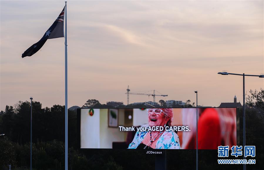 4月15日,在澳大利亞悉尼,戶外廣告牌上打出“感謝老年護(hù)理工作者”的字樣,感謝在疫情期間工作的人們。新華社記者白雪飛攝
