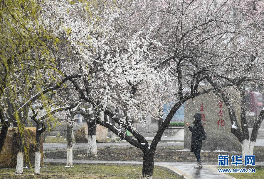 4月21日,市民在長(zhǎng)春市杏花村公園觀賞雪景。當(dāng)日,吉林省多地迎來(lái)降雪天氣。新華社記者許暢攝