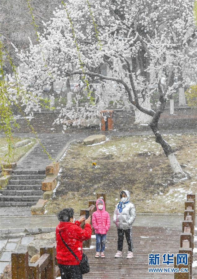 4月21日,在長春市杏花村公園,市民在雪中拍照留念。當日,吉林省多地迎來降雪天氣。新華社記者許暢攝