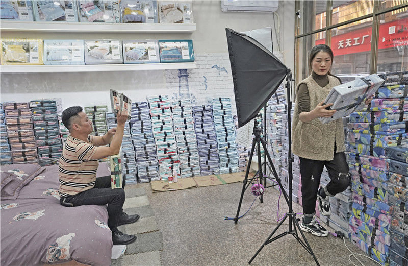 2019年11月11日,浙江金華,義烏北下朱村,一名男子在直播。一名女子在購(gòu)物。