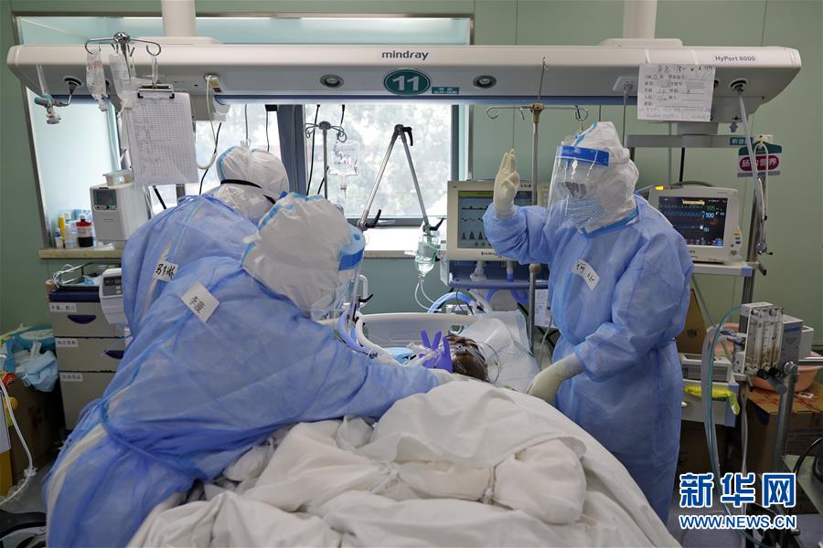 4月24日,在位于武漢的華中科技大學(xué)同濟(jì)醫(yī)學(xué)院附屬協(xié)和醫(yī)院西院,醫(yī)務(wù)人員馬夢(mèng)琳、李菠、何玨(從左至右)在護(hù)理核酸檢測(cè)結(jié)果轉(zhuǎn)陰的新冠肺炎病人。新華社記者沈伯韓攝
