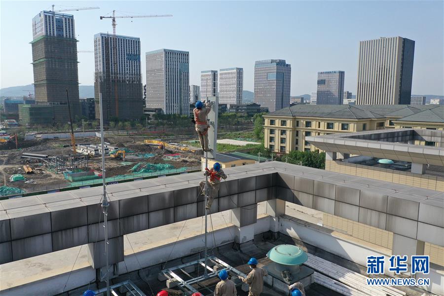 4月25日,在南京220千伏城南河變電站屋頂,工人在架設(shè)設(shè)備(無(wú)人機(jī)照片)。當(dāng)日,三大通信運(yùn)營(yíng)商的2座5G、3座4G基站建設(shè)工作在南京220千伏城南河變電站屋頂有序展開(kāi)。在變電站內(nèi)建設(shè)基站可有效利用電網(wǎng)資源,縮短建設(shè)周期,節(jié)約建設(shè)成本。新華社記者季春鵬攝