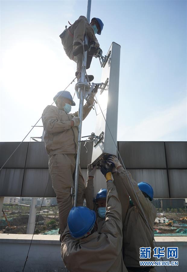 4月25日,在南京220千伏城南河變電站屋頂,工人在架設(shè)4G設(shè)備。當(dāng)日,三大通信運(yùn)營(yíng)商的2座5G、3座4G基站建設(shè)工作在南京220千伏城南河變電站屋頂有序展開(kāi)。在變電站內(nèi)建設(shè)基站可有效利用電網(wǎng)資源,縮短建設(shè)周期,節(jié)約建設(shè)成本。新華社記者季春鵬攝