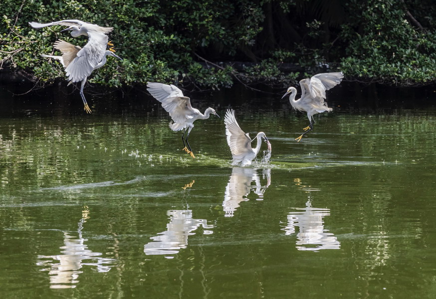 4月15日,攝于南山區(qū)華僑城天鵝堡附近。這是深圳拍鷺鳥的其中一個(gè)好去處。四只白鷺在水面上爭相捕食。徐捷