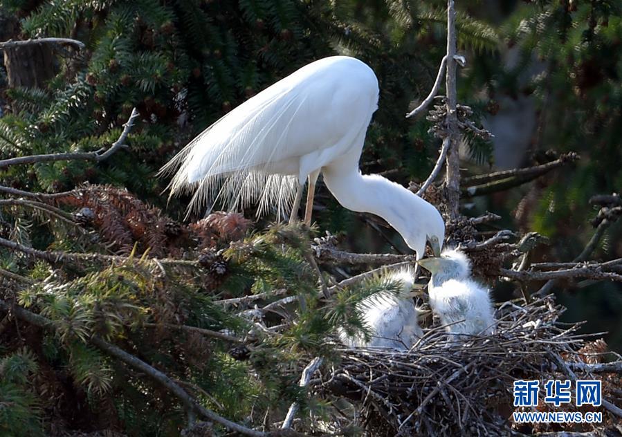 在象山森林公園,白鷺和幼鳥在一起(4月26日攝)。近日,在江西省南昌市新建區(qū)象山森林公園內(nèi),已安家筑巢的大批鷺鳥正陸續(xù)孵化后代,一派生機(jī)勃勃的景象。新華社記者彭昭之?dāng)z