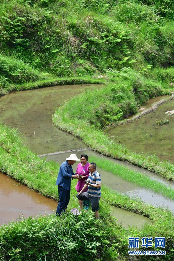 3月25日,在桂黔烏英苗寨,村民往稻田里投放螺苗。新華社記者黃孝邦攝