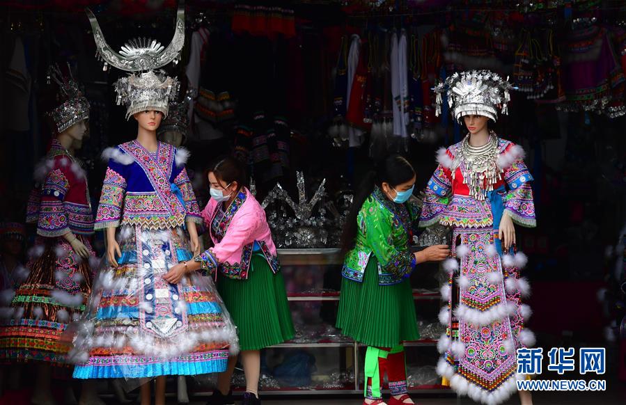 在廣西融水苗族自治縣一家苗族服飾作坊,39歲的黃玉萍(左)和工人在整理服飾(3月13日攝)。