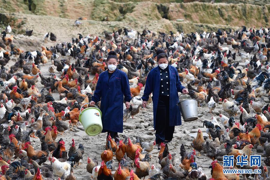 在廣西融水苗族自治縣香粉鄉(xiāng)香粉村,34歲的吳春穎(右)和妹妹吳冬仙在養(yǎng)殖場(chǎng)里喂雞(3月14日攝)。